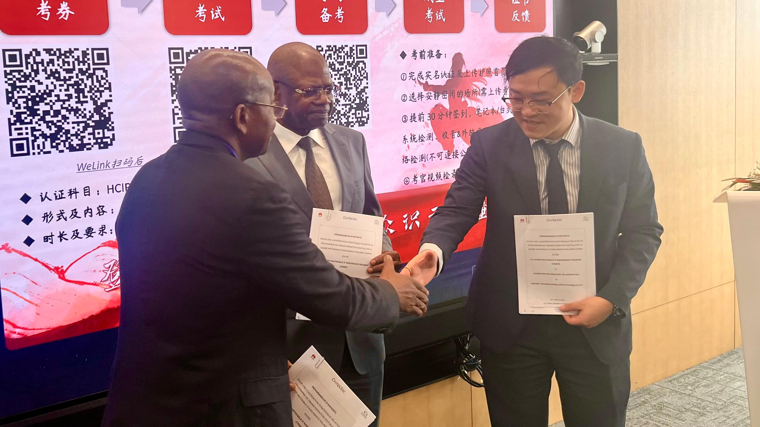 L’accord a été signé par le Directeur Général de la CNAM, M. Karim Bamba, d’une part, et par MM. Dong Jug et Sidibé Adama, respectivement Administrateur général de Huawei Technologies Côte d’Ivoire et président Directeur Général de Computec Technology, d’autre part.